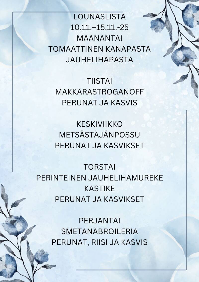 Lounasta tarjolla arkisin klo 10.30 alkaen, klo 14.30 saakka tai niin pitkään, kun ruokaa riittää.